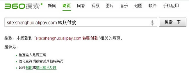 為了驗證其他國內搜索引擎是否有相關現象出現,筆者分別使用了“付款轉賬”“支付寶轉賬”“site:shenghuo.alipay.com付款轉賬”等相關關鍵詞在百度、360綜合搜索、SOSO搜索來進行驗證,結果發現,百度搜索對所有關鍵詞的搜索都會得出數量不多的相關項目,但是并沒有出現類似谷歌搜索中用戶轉賬支付信息,而360綜合搜索與SOSO搜索對于中文文字關鍵詞搜索也得出了一部分的搜索相關項,但在使用“site:shenghuo.alipay.com付款轉賬”搜索時卻沒有任何結果。如下圖: